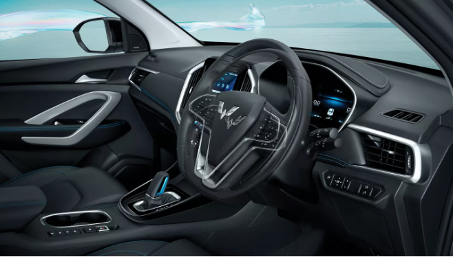 Wuling Almaz memiliki 7 gambar interior, diantaranya Tombol start-stop mesin, Pengendali di pintu sisi pengemudi, Pengatur kursi, Lampu dalam, Tuas transmisi, Power outlet, Handle pintu dalam.